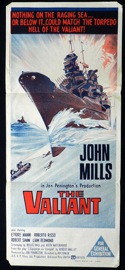 The Valiant is a 1962 British/Italian international co-production film directed by Roy Ward Baker and starring John Mills, Ettore Manni, Roberto Risso, Robert Shaw, and Liam Redmond. It is based on the Italian manned torpedo attack which seriously damaged the two British battleships Valiant and Queen Elizabeth and the oil tanker Sagona at the port of Alexandria in December 1941.